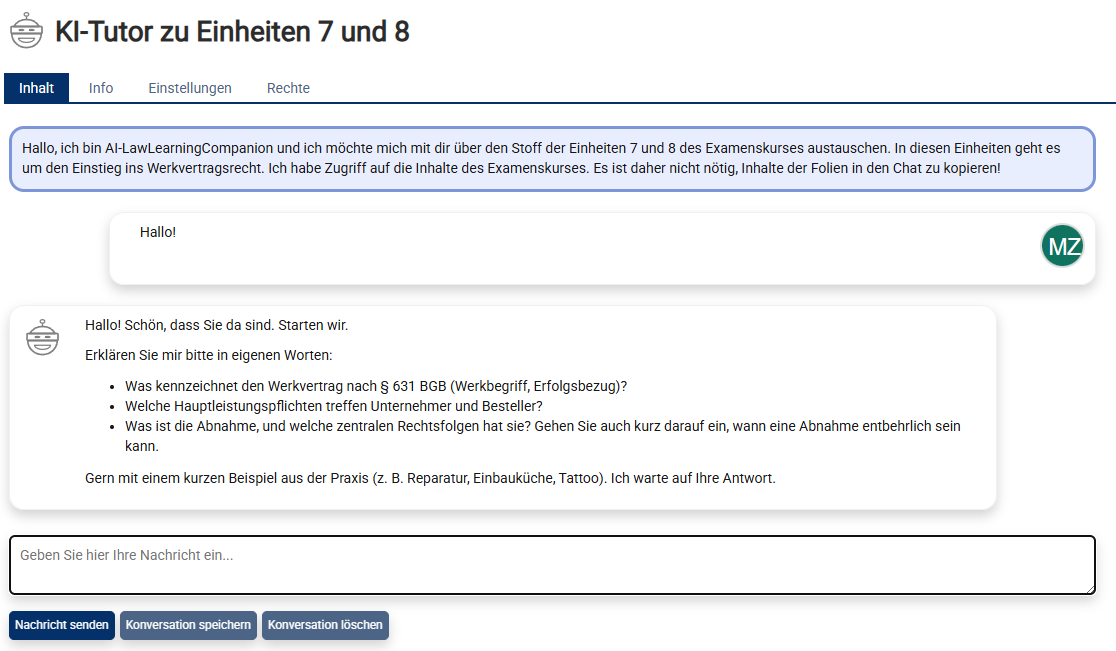 Unser im Rahmen des FAU-Innovationsfonds Lehre 2024/25 konzipierter KI-Tutor AI-Law Learning Companion (AI-LLC) ging im Wintersemester 2025/26 in den Echtbetrieb. Im Examenskurs „Rechtsgeschäftliche Schuldverhältnisse“ und in der Vorlesung Schuldrecht Allgemeiner Teil hatten die Studierenden die Möglichkeit, sich in einem Textchat mit einem großen KI-Sprachmodell über den Stoff der jeweiligen Einheiten zu unterhalten.